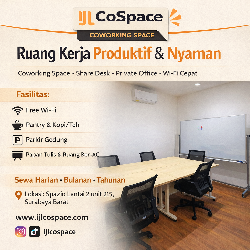 Jadwalkan survey anda sekarang juga. IJLCoSpace. Alamat Spazio lantai 2 unit 215, Surabaya. Jam Operational Sewa Harian: Senin - Jumat: 09.00 - 17.00. Sabtu: 09.00-14.00